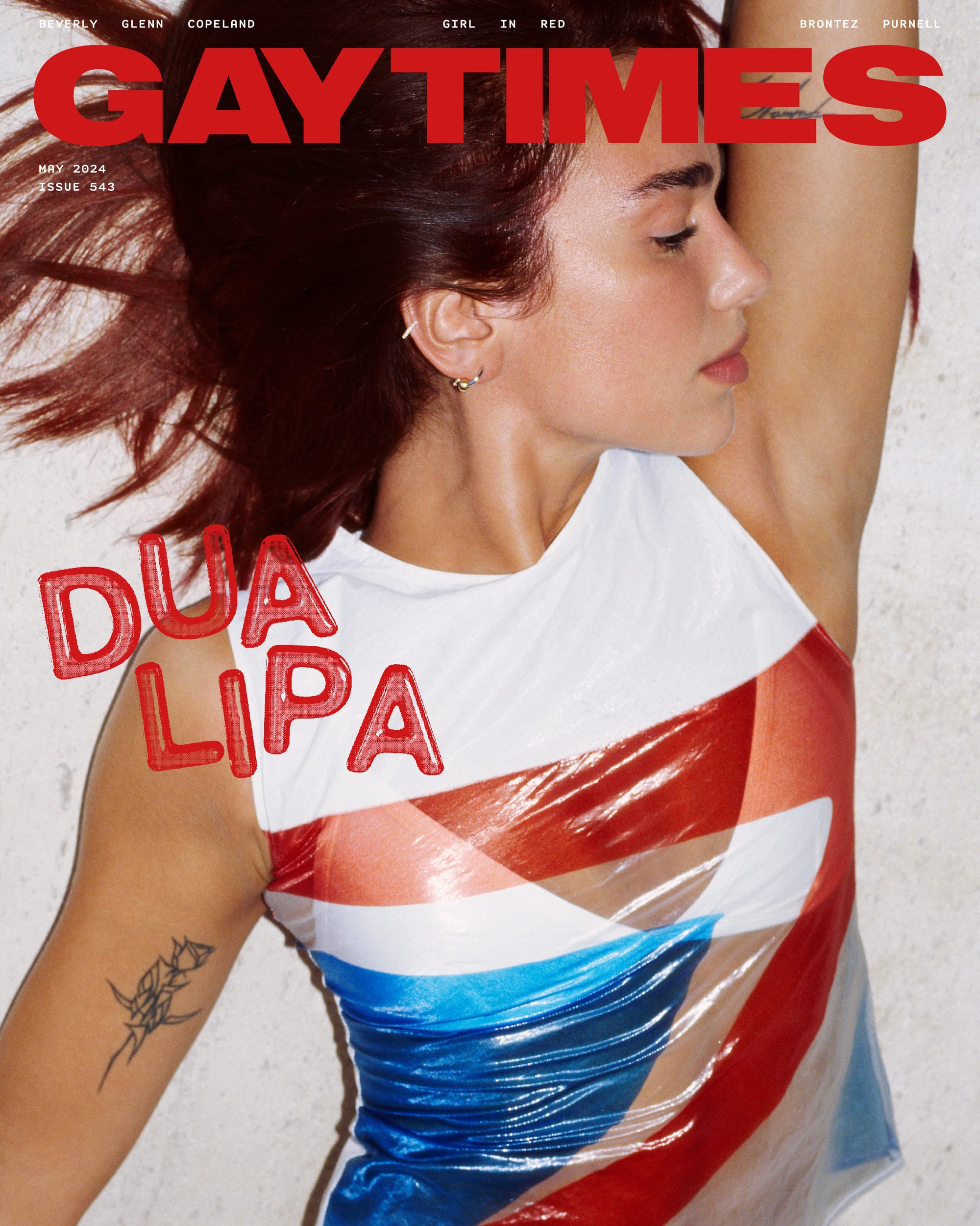 “I saw a rainbow the other day,” Dua Lipa, ally, shares with GAY TIMES. Although the radical optimist didn’t immediately associate the multicoloured-arc-formed-by-light-striking-water-droplets with the alphabet mafia (sacrilege, really), we’ll let her off: she’s been an avid supporter of the LGBT’s since her 2016 synthpop debut ‘New Love’, performing at Heaven in her “first-ever London shows” and proudly flying the flag with performances at Pride. More recently, Dua has showcased her unrivalled painting prowess with Trixie Mattel, defended her “Vacanza Queen” title on Las Culturistas and paid homage to “Dula Peep” on SNL, all of which has officially solidified her place as an icon for the queers and, of course, a “mother”.
